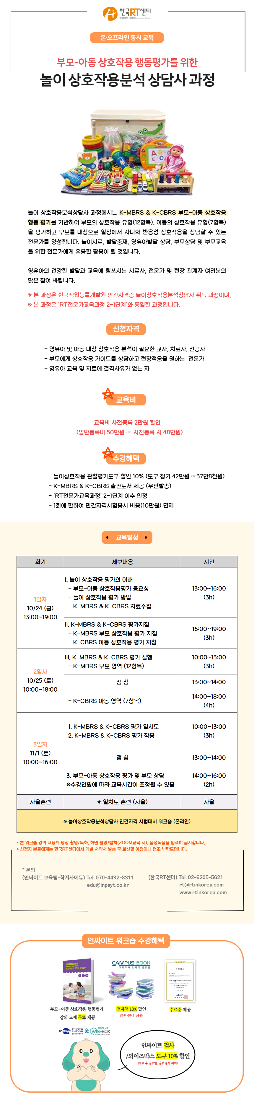 * 본 과정은 한국직업능률개발원 민간자격증 놀이상호작용분석상담사 취득 과정으로, 자격증 관련 세부 문의는 한국RT센터로 연락주시기 바랍니다. (RT전문가교육과정 2-1단계 이수 인정)
