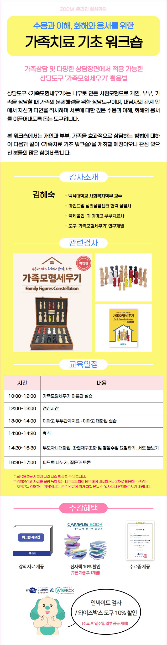 * 워크숍 참석 시 '가족모형세우기' 도구가 있으신 분들은 지참해주시면 좋으나 없으신 분들도 수강 가능하시오니 참고해주시기 바랍니다. 워크숍을 수강하시면서 해당 도구 구매를 원하시는 분은 할인 혜택을 드리려 하오니, 사전에 저희 교육팀(Tel. 070-4432-8311)으로 연락 부탁드립니다.