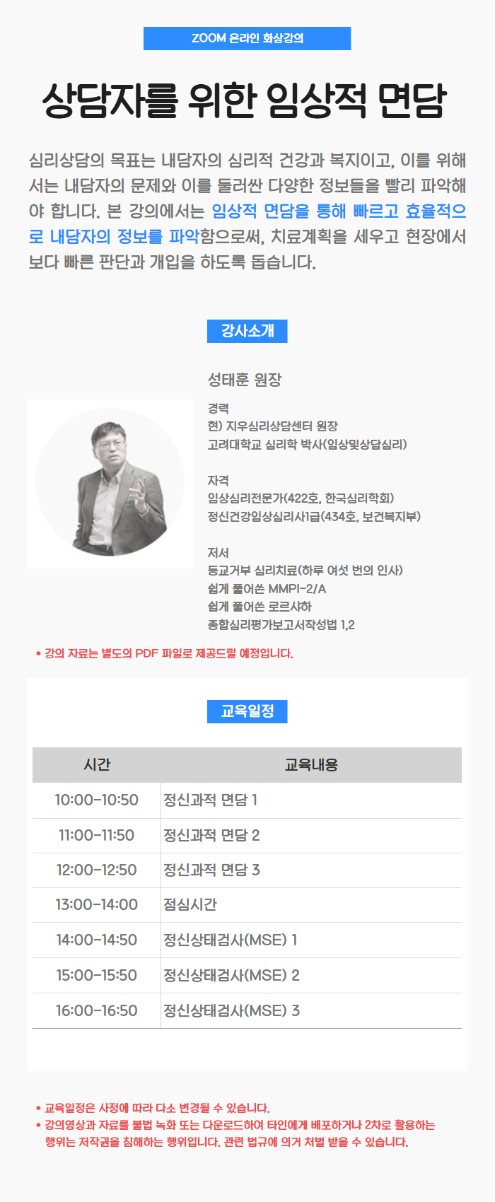 ※ Notice 해당 워크숍은 교육만족도 증진을 위한 정보 활용 목적으로 강의녹화가 진행되며, 녹화영상은 워크숍 종료 일주일 후 일괄 삭제됩니다. (수강생 제공용 X)