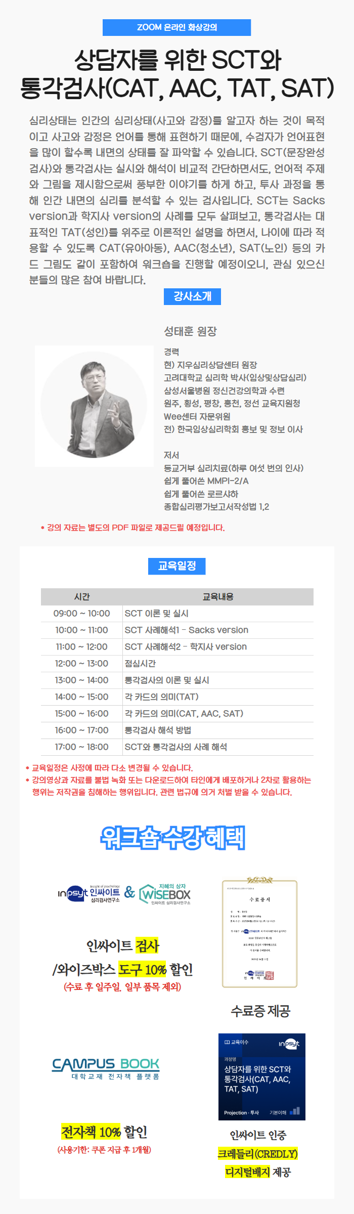 * 본 과정은 기존 <문장완성검사(SCT)와 주제통각검사(TAT) 워크숍>에서 리뉴얼 된 과정입니다.