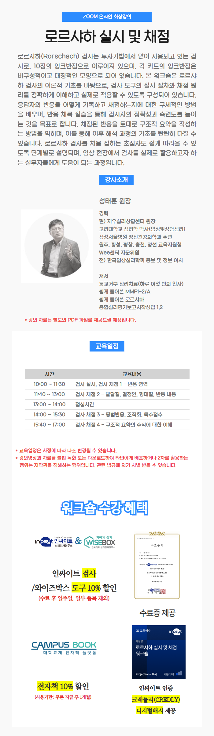 * 주교재인 도서 <로르샤하 종합체계 워크북(5판) (학지사)>는 개별로 준비해주세요.