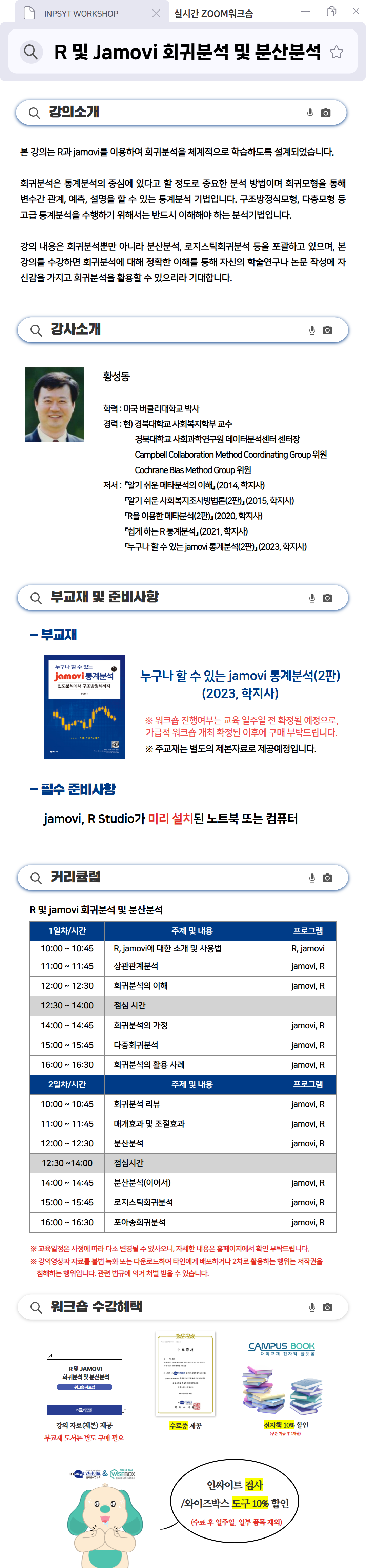 부교재는 학지사 신간 『누구나 할 수 있는 jamovi 통계분석(2판)』으로 개별 구비해주시기 바랍니다.