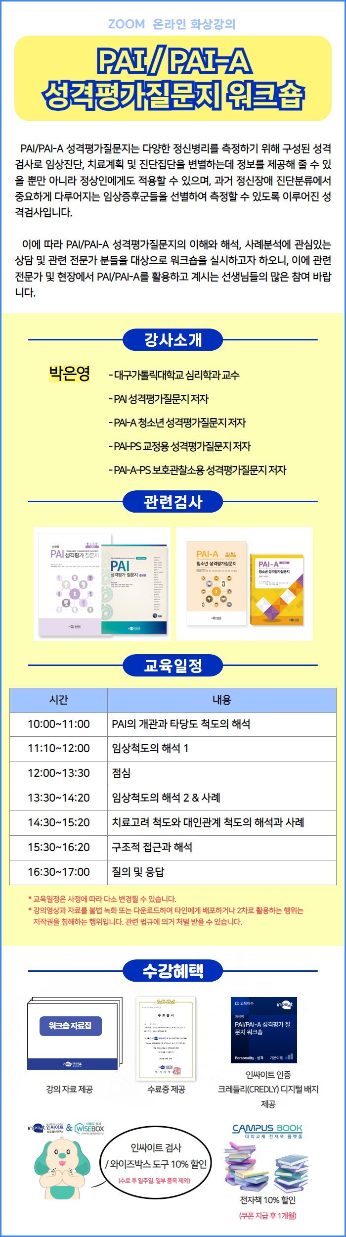 * 워크숍 수강생 분들 대상으로 워크숍 후 검사 구매 할인 혜택을 드릴 예정이오며,