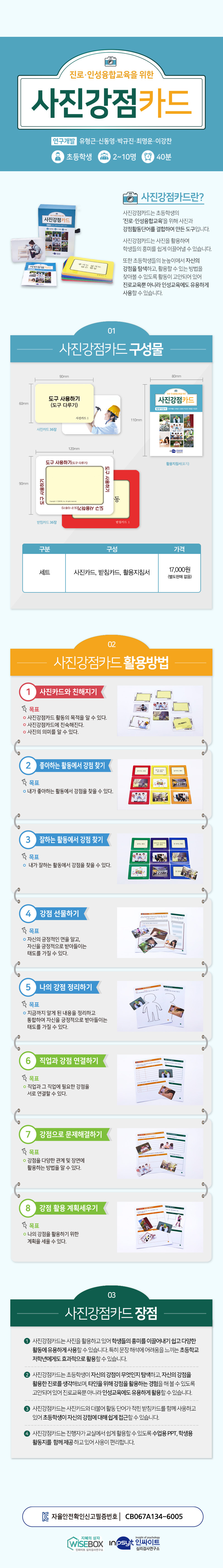 초등학생의 진로·인성융합교육을 위해 사진과 강점활동단어를 결합하여 만든 도구로 초등학생의 눈높이에서 자신의 강점을 탐색하고, 활용할 수 있는 방법을 찾아 볼 수 있도록 활동이 고안되어 있어 진로교육 뿐 아니라 인성교육에도 유용하게 사용할 수 있다.