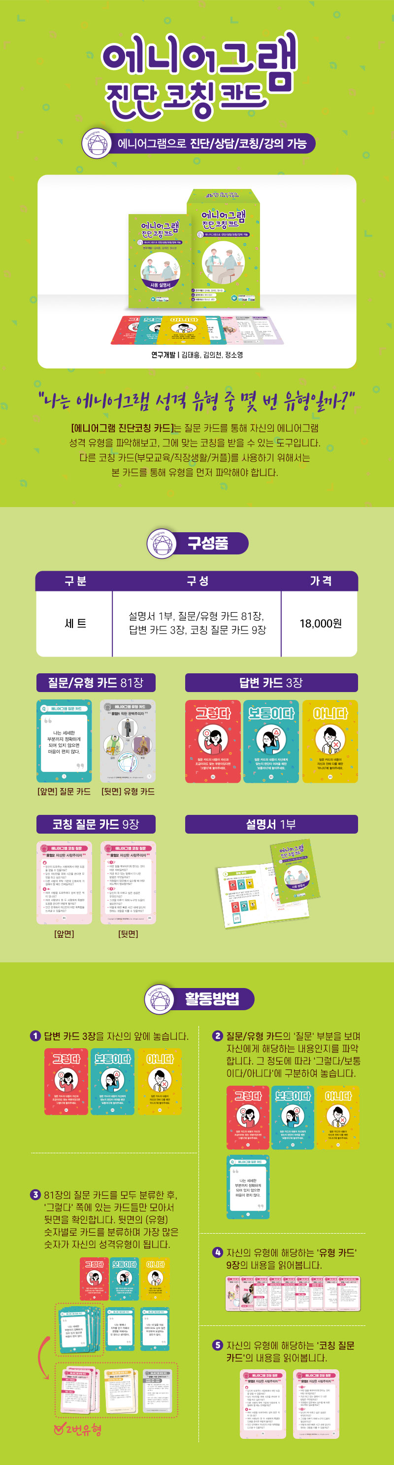 [에니어그램 진단코칭 카드]는 질문 카드를 통해 자신의 에니어그램 성격 유형을 파악해보고, 그에 맞는 코칭을 받을 수 있는 도구입니다. 다른 코칭 카드(부모교육/직장생활/커플)를 사용하기 위해서는 본 카드를 통해 유형을 먼저 파악해야 합니다.