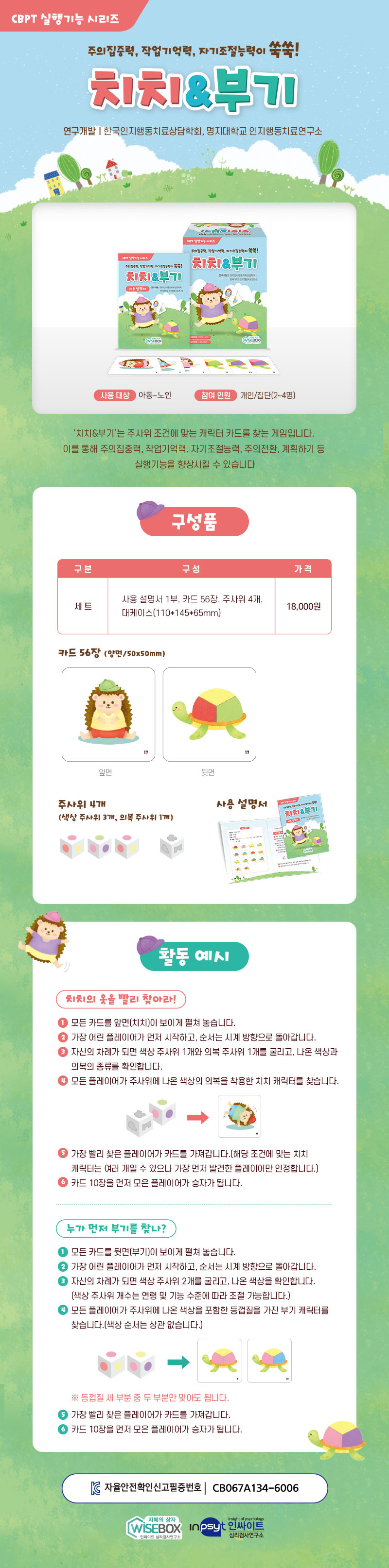 '치치&부기'는 주사위 조건에 맞는 캐릭터 카드를 찾는 게임입니다. 이를 통해 주의집중력, 작업기억력, 자기조절능력, 주의전환, 계획하기 등 실행기능을 향상시킬 수 있습니다.
