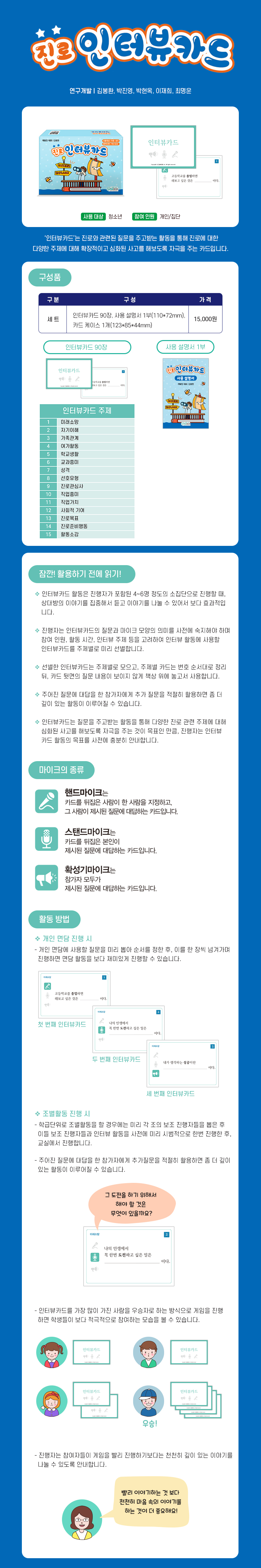 '인터뷰카드'는 진로와 관련된 질문을 주고받는 활동을 통해 진로에 대한 다양한 주제에 대해 확장적이고 심화된 사고를 해보도록 자극을 주는 카드입니다.