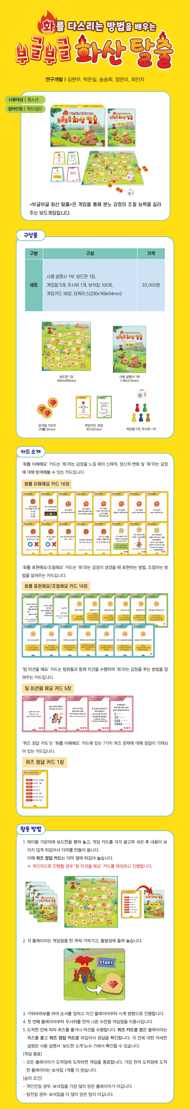 부글부글 화산 탈출은 게임을 통해 분노 감정의 조절 능력을 길러주는 보드게임입니다.