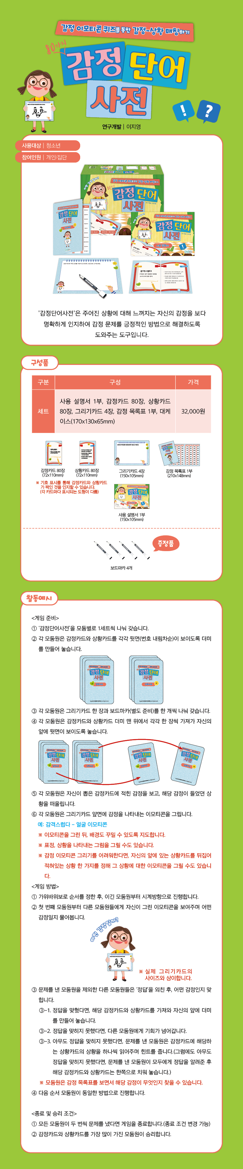 '감정단어사전'은 아이들이 주어진 상황에 대해 느껴지는 자신의 감정을 보다 명확하게 인지하여 감정 문제를 긍정적인 방법으로 해결하도록 도와주는 도구입니다.
