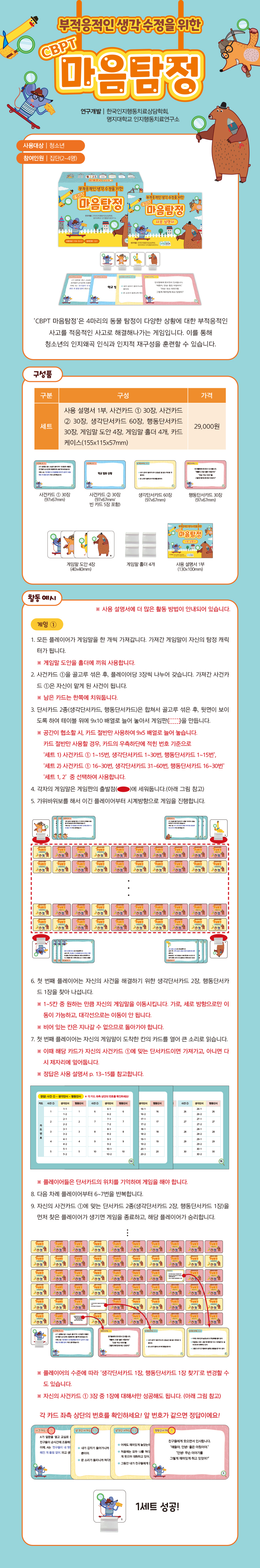 'CBPT 마음탐정'은 4마리의 동물 탐정이 다양한 상황에 대한 부적응적인 사고를 적응적인 사고로 해결해나가는 게임입니다. 이를 통해 청소년의 인지왜곡 인식과 인지적 재구성을 훈련할 수 있습니다.