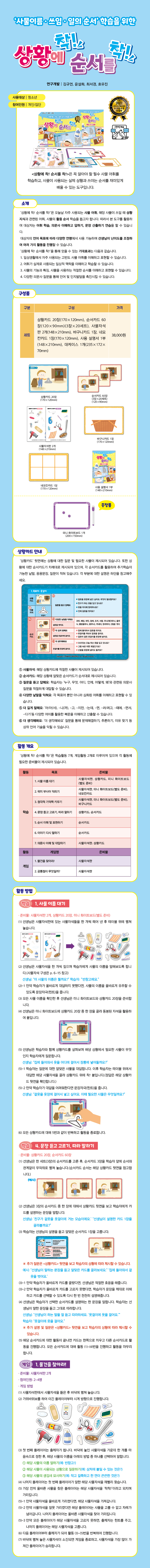 '상황에 착! 순서를 착!'은 꼭 알아야 할 필수 사물 어휘를 학습하고, 사물이 사용되는 실제 상황과 쓰이는 순서를 재미있게 배울 수 있는 도구입니다.