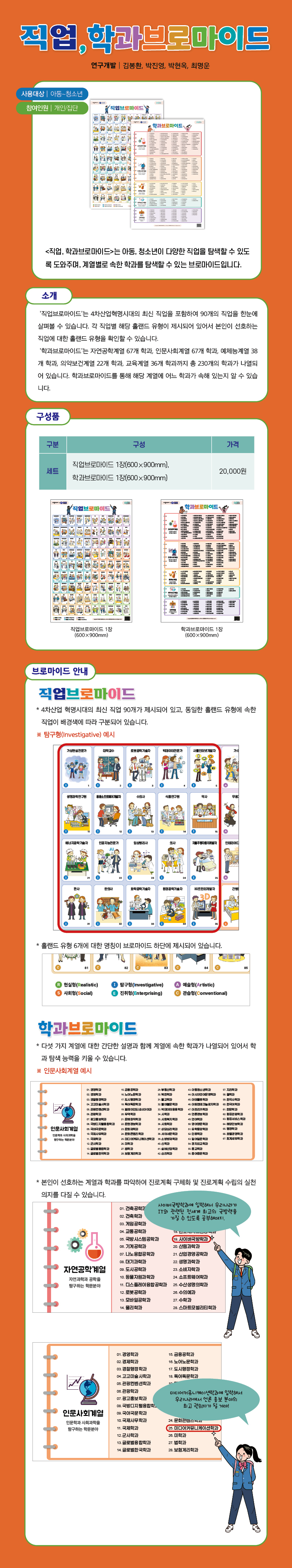 '직업, 학과브로마이드'는 아동, 청소년이 다양한 직업을 탐색할 수 있도록 도와주며, 계열별로 속한 학과를 탐색할 수 있는 브로마이드입니다.