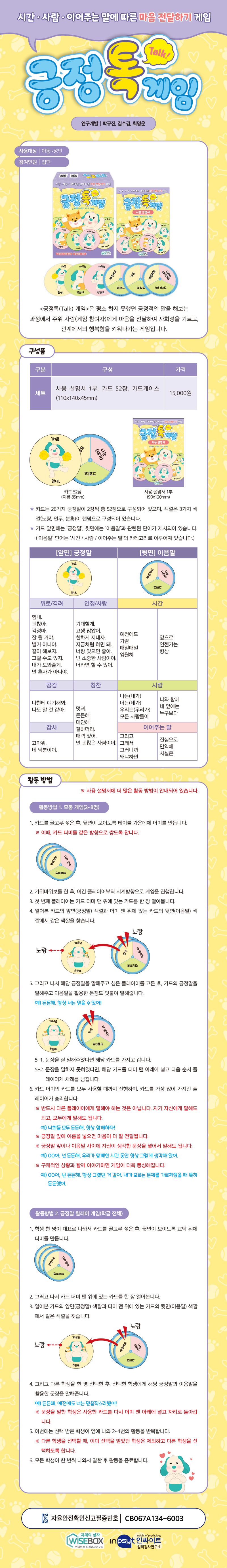 <긍정톡(Talk) 게임>은 평소 하지 못했던 긍정적인 말을 해보는 과정에서 주위 사람(게임 참여자)에게 마음을 전달하여 사회성을 기르고, 관계에서의 행복함을 키워나가는 게임입니다.