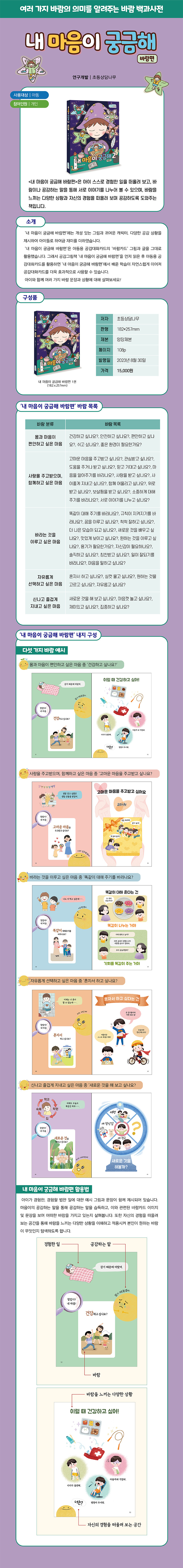 '내 마음이 궁금해 바람편'은 바람이나 공감하는 말을 통해 서로 이야기를 나누어 볼 수 있으며, 바람을 느끼는 다양한 상황과 자신의 경험을 떠올려 보며 공감하도록 도와주는 책입니다.