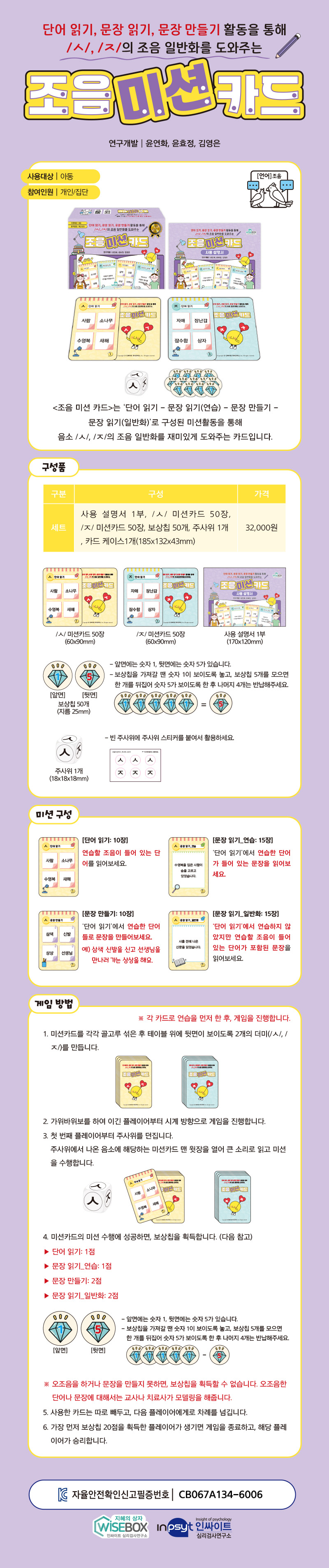<조음 미션 카드>는 ‘단어 읽기 - 문장 읽기(연습) - 문장 만들기 - 문장 읽기(일반화)’로 구성된 미션활동을 통해 음소 /ㅅ/, /ㅈ/의 조음 일반화를 재미있게 도와주는 카드입니다.