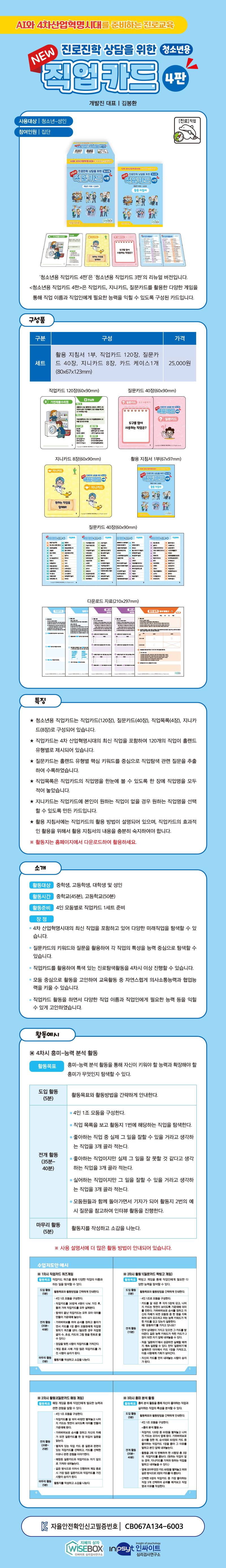 <청소년용 직업카드 4판>은 직업카드, 지니카드, 질문카드를 활용한 다양한 게임을 통해 직업 이름과 직업인에게 필요한 능력을 익힐 수 있도록 구성된 카드입니다.