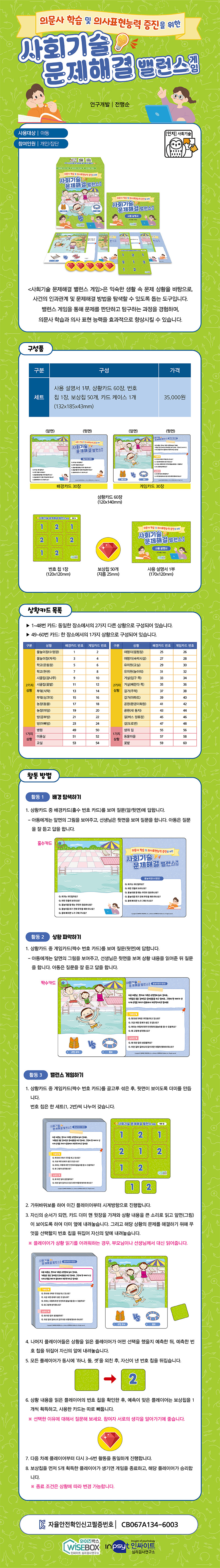 <사회기술 문제해결 밸런스 게임>은 익숙한 생활 속 문제 상황을 바탕으로, 사건의 인과관계 및 문제해결 방법을 탐색할 수 있도록 돕는 도구입니다. 밸런스 게임을 통해 문제를 판단하고 탐구하는 과정을 경험하며, 의문사 학습과 의사 표현 능력을 효과적으로 향상시킬 수 있습니다.