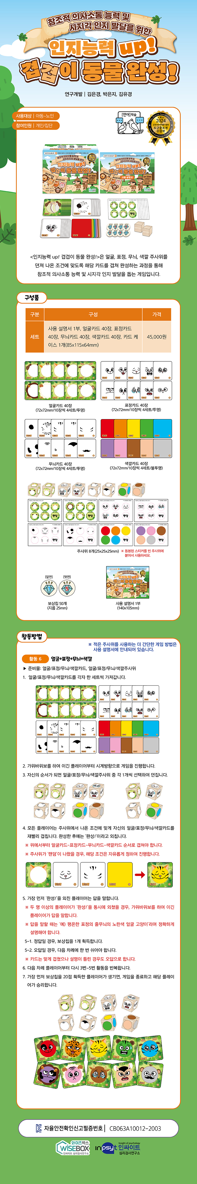 <인지능력 up! 겹겹이 동물 완성!>은 얼굴, 표정, 무늬, 색깔 주사위를 던져 나온 조건에 맞도록 해당 카드를 겹쳐 완성하는 과정을 통해 참조적 의사소통 능력 및 시지각 인지 발달을 돕는 게임입니다.