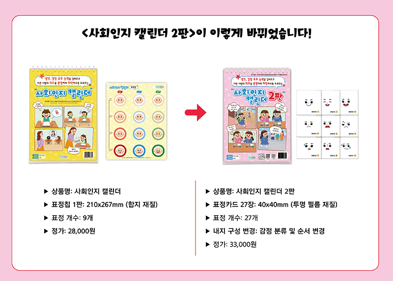 <사회인지 캘린더 2판>은 '사회인지 캘린더'의 리뉴얼 버전입니다. 생각, 감정 유추 능력을 길러주고 다른 사람의 의도를 분명하게 파악하도록 도와주는 도구입니다.